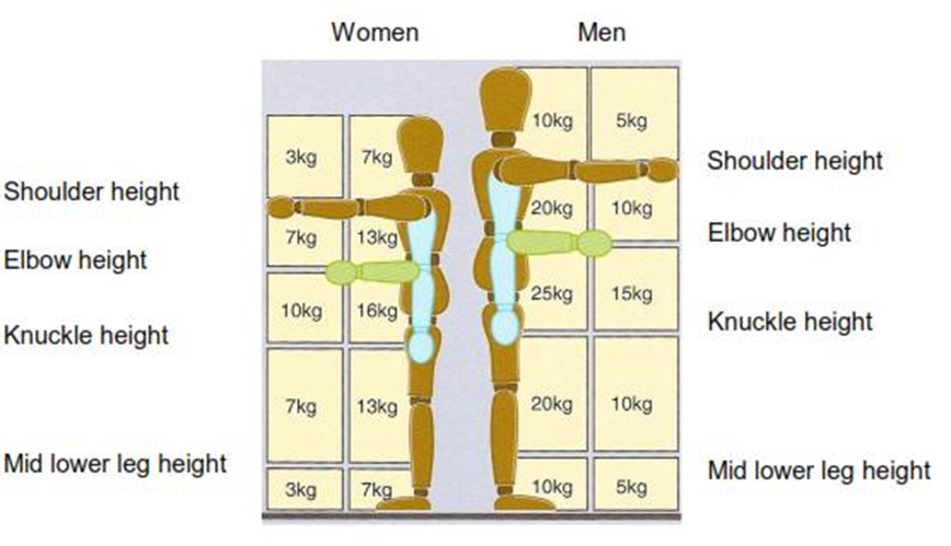 The Regulations do not establish absolute limits on the maximum weights that can be lifted but do provide guidelines; these are 25kg for men and 16kg for women, where the load is at waist height. At any position other than waist height these limits are reduced progressively to 10kg for men and 7kg for women, at head or ankle height.